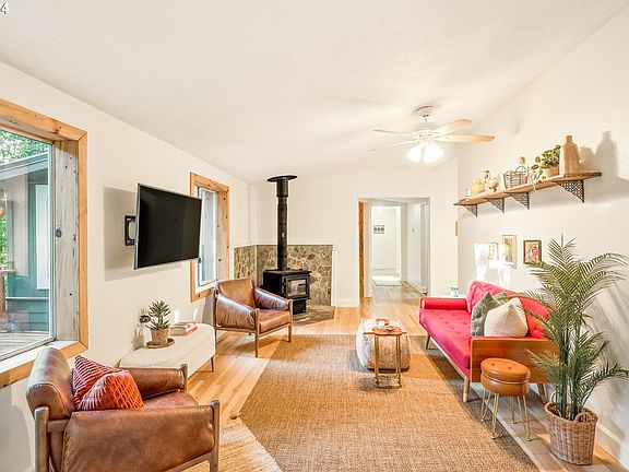 Motivated Seller! Beautiful Ranch style home on a stunning property! Come and enjoy the peaceful wooded sunsets and all that Oregon City has to offer. This manufactured on real property banger is not to be missed! You'll be greeted by a lovely field to the right of the home and a large shop to the left. Once inside the warmth of the updated hardwoods helps to fill the space with light. Skylights and painted cabinetry, butcher block counters and a farmhouse sink add to the country feel in the kitchen which opens into the dining area. The fully wrapped deck is steps away out the french doors where you can enjoy the sounds of the pond feature and fire pit. The living room has great lighting and views with a wood burning stove for long winters. The primary bedroom is truly something special featuring a huge walk-in closet, private bath, walk-in shower and custom vanity. All steps away to your hot tub just outside a private entrance to the room. The home features 2 other well sized bedrooms and an additional full bath. New dishwasher and microwave. This property is a gem and not to be missed!