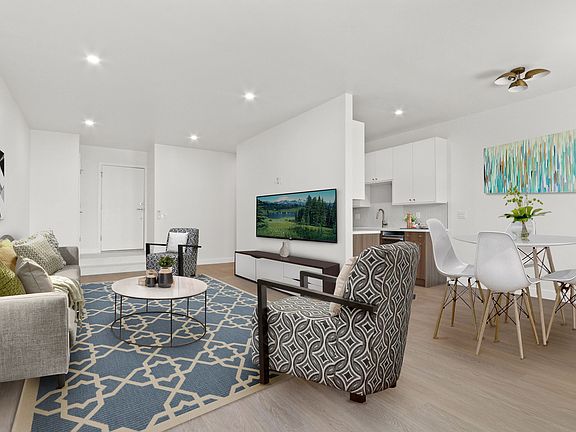 The spacious living and dining area opens to a cozy balcony through sliding doors, perfect for morning coffee or relaxing after a busy day. The open floor plan connects to a sleek, modern kitchen featuring Caesarstone countertops and stainless-steel appliances, including a refrigerator, stove, and microwave. With generous counter space, meal prep is a breeze. A laundry closet with an upgraded washer and dryer adds extra convenience.