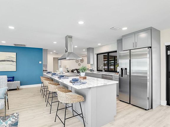 Welcome to this beautifully renovated Gulf access pool home, offering 3 bedrooms and 2 bathrooms on a premium waterfront lot. Designed for both style and functionality, this home has undergone an extensive $120K+ renovation, showcasing modern upgrades and timeless finishes throughout. The open-concept floor plan is enhanced by wide plank vinyl flooring that runs seamlessly through every room, complemented by 5” baseboards and newer interior doors. The kitchen is the centerpiece of the home, featuring gray-blue shaker soft-close cabinetry, a 120” quartzite island, subway tile backsplash, stainless steel appliances, and a dry bar with wine cooler and freestanding pantry—perfect for entertaining. Both the primary and guest bathrooms have been thoughtfully renovated with shiplap accents, shaker vanities topped with quartzite, custom-tiled showers, and a newer soaking tub in the guest bath. Updated fixtures include LED recessed lighting, chandeliers, faucets, sinks, mirrors, and door hardware. The primary suite offers a walk-in closet and direct access to the pool and lanai, where water views create a serene backdrop. Nearly every room in the home overlooks the wide, deep-water canal. Step outside to enjoy the new heated salt water pool with Pebble Tec finish and spacious screened lanai, both installed in 2023, or take advantage of the synthetic wood boat dock (installed in 2024) with 13,000lbs boat lift and 7,000lbs jet ski lift, equipped with water and electric. Boaters will appreciate the quick 15-minute access to open water, making this property a true Gulf access retreat. Additional updates include newer hurricane impact windows with accordion shutters on the lanai sliders, a full plumbing re-pipe, and fresh interior and exterior paint. The thoughtful upgrades blend seamlessly with the home’s waterfront setting, creating a move-in ready property with modern coastal appeal. Furnishings are negotiable.