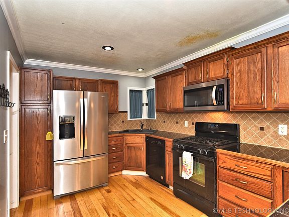 Charming bungalow with classic character and modern updates! Wood floors throughout, arched doorways and a built-in china cabinet in the dining room. The updated kitchen features modern cabinetry, granite tile countertops, and updated appliances. A spacious foyer offers room for a piano or sitting area, and the living room boasts a cozy fireplace. The partial basement provides storage and a storm shelter. Detached two-car garage includes a large upstairs room perfect for a studio, workshop, or storage. Recent updates include new electrical service and panel (2025), newer HVAC (2023), and a whole-home water filtration system (2020).