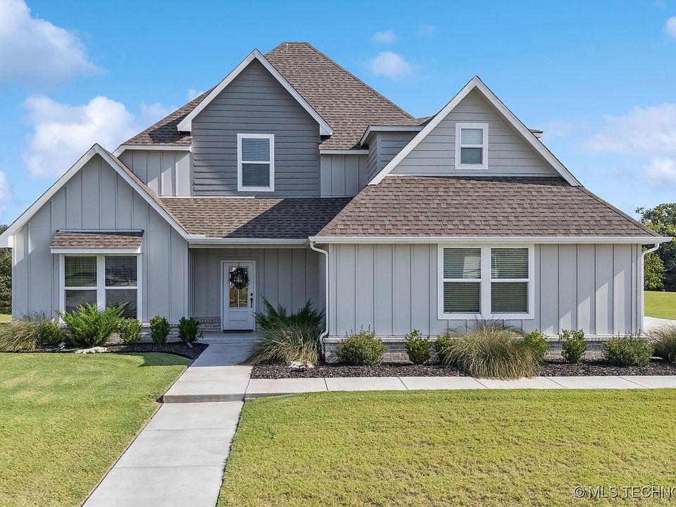 Situated in a scenic subdivision with rolling hills and mature trees, this stunning home is loaded with designer touches that set it apart. The entertainer's floor plan features a massive open living, dining, and kitchen area with a sky-high vaulted ceiling accented by distressed beams and a wall of windows overlooking the covered back patio with breathtaking views. The oversized primary suite boasts a vaulted ceiling, spa-like bath with a soaking tub, and a huge separate shower. A downstairs guest suite has access to a full bath, while upstairs offers two spacious bedrooms, a full bath, and a versatile bonus room. The expansive .53 acre lot provides plenty of room to build an additional shop or detached garage, adding flexibility and value. Neighborhood amenities include a splash pad, sidewalks, and a welcoming community atmosphere.