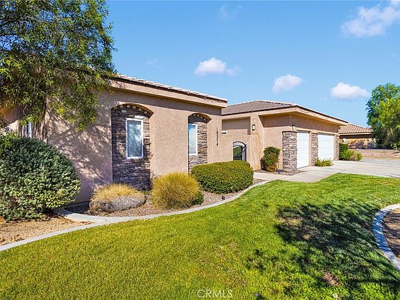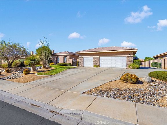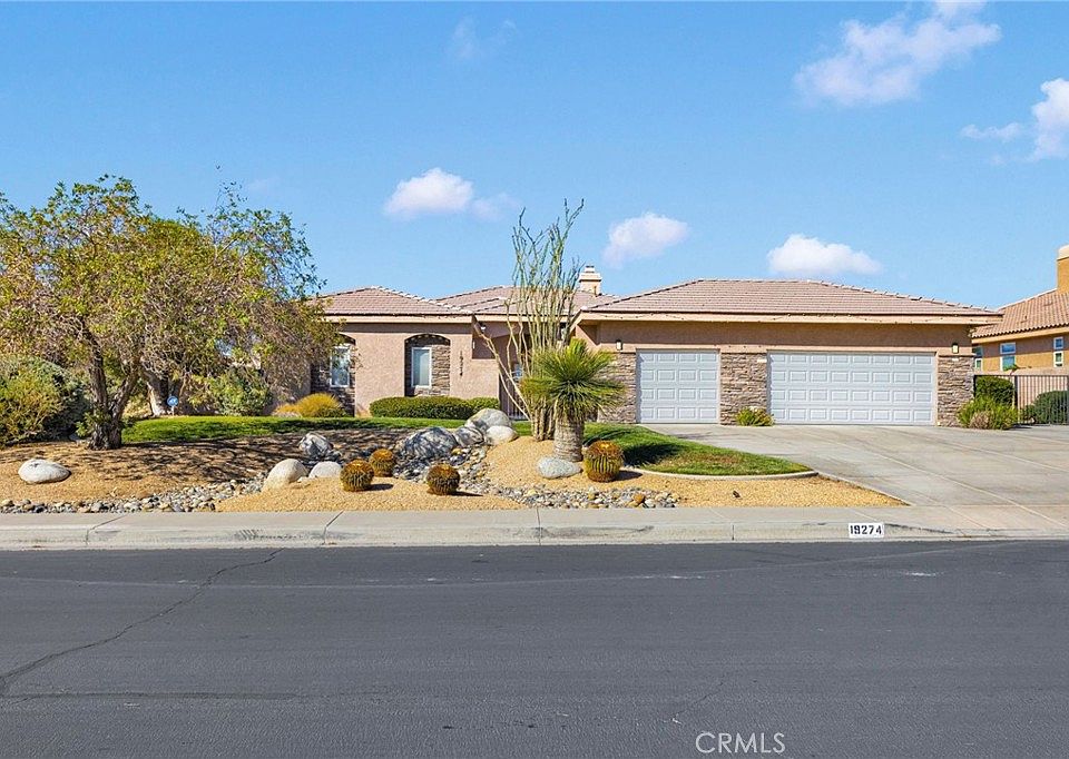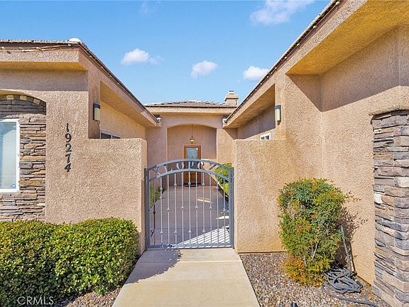 Welcome to 19274 Kanbridge St located in one of the most exclusive communities in the High Desert. Stonebrook Estates. As you walk past the gated courtyard you are greeted with an inviting living room and 12-foot ceilings. A bar nook completes this space perfect for entertaining family and friends. This home features a bright, open floor plan with a beautifully appointed kitchen showcasing granite countertops and a spacious breakfast nook. A formal dining room offers the ideal setting for family dinners or hosting special occasions. The primary bedroom is thoughtfully positioned for privacy, separate from the other bedrooms. It features a luxurious ensuite bath with dual vanities, a jetted tub, a walk-in shower and dual closets - one of which is a walk-in. Enjoy the warmth and charm of not one, but three fireplaces, located in the living room, breakfast nook and primary bedroom. You have an indoor laundry room with storage cabinets. A three-car garage to store your toys. RV parking potential. Outside, both the front and backyard feature low maintenance desert landscaping, providing beauty and ease of care. Home is equipped with solar panels for energy efficiency. Who needs a high maintenance pool when you are a house away from it? Stonebrook Estates offers private security patrol, tennis and pickleball courts, a community pool, clubhouse and is only minutes away from shopping and dining.