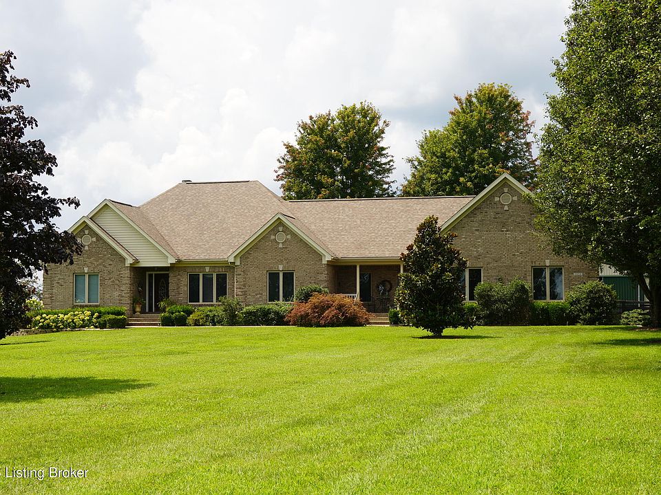 It's not often that a home of this quality becomes available with a 36' x 72' barn and board fencing on 5 beautiful acres. Set in a quiet Oldham County neighborhood just 10 minutes from I-71, this is a custom built 4200 sq ft+ home by Tim Menard and it shows- lots of quality trim, crown moldings, custom blinds and Pella windows. The leaded glass front door leads to an open plan comprised of a large formal dining room with a tray ceiling and a great room with a stacked stone fireplace. The large kitchen overlooks the great room and breakfast area. There are tons of beautiful hickory cabinets and Corian counters surrounding quality appliances including Advantium and convection cooking. One wall has a stunning buffet with glass front cabinets and the range has a custom wood vent hood. Also off the foyer is a study with glass French doors that can serve as the 4th bedroom. The primary suite includes a large bedroom with a lit double tray ceiling, 2 walk in closets, double vanity, shower and a jet tub surrounded by leaded glass windows. On the other side of the home are 2 more bedrooms and a full bath. Off the kitchen is a good sized laundry room with a lovely view of the large front lawn and blooming trees. A guest half bath and access to the 3 car garage complete the main level. In the huge walkout basement, there is tons of space that could be utilized in a variety of ways. The family room centers around the large wet bar that includes a dishwasher- one area for TV viewing, another with plenty of windows is perfect for pool and game tables, still another room serves as the exercise area. There's also a full bath and plenty of storage in the unfinished area. The mechanicals are top notch- a Generac 26kW whole house generator, an HVAC system that includes a propane supported heat pump system and the roof is only 6 years old. Outside there is a nice deck with a retractable awning overlooking fruit trees, flowers and berry brambles. The barn is ready for your horses or hobbies with water and electric. It's a great pasture thanks to frequent mowing and there's even a large vegetable garden by the barn. This gracious property has it all and the original owners hate to leave it.