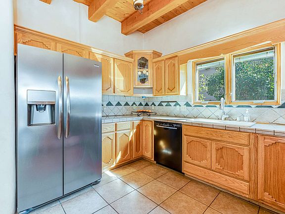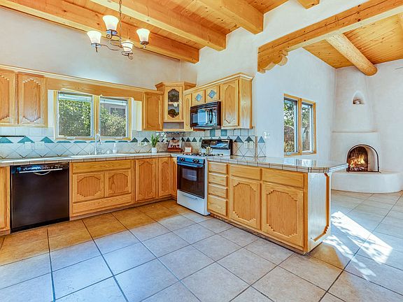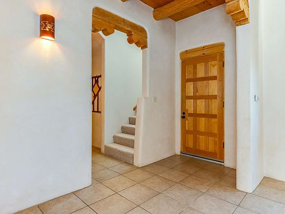 "You've arrived! This open and bright Midtown custom-built property comes with a versatile open floor plan. You are in walking/driving distance to amazing restaurants, coffee shops, World renowned Meow Wolf and grocery stores. Custom diamond plaster walls in open living areas including kiva fireplace with tiled hearth, handsome wood accents, high ceilings, beams and vigas,custom cabinets in kitchen with lots of counter space and opens into your dining area with kiva fireplace and direct access to your back patio. Property is located on lot which backs up to an arroyo. Primary Bedroom is located on the main level with walk-in closet and ensuite bath which offer privacy. The 2 secondary bedrooms with den and full bath on second level - offer more privacy and refreshing views of the treetops. Additional features include laundry room, walk-in pantry and attached two car garage. The back yard is fenced with two separate gates with native landscaping, raised planter beds, pergola, two storage sheds, a greenhouse, putting green and custom waterfall feature. You will know this is a very thoughtfully crafted home - Be prepared to be delighted.