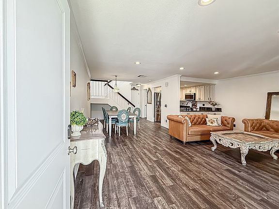 The living room features smooth ceilings with recessed smart lighting, dual-paned windows, rich tumble-travertine and wood-like tile flooring, and a charming raised-hearth brick fireplace that instantly feels like home. The space flows easily into the dining area and remodeled kitchen, where you’ll find stunning granite countertops, custom cabinetry, Samsung stainless-steel smart appliances, recessed smart lighting, and a breakfast bar perfect for casual meals or morning coffee.