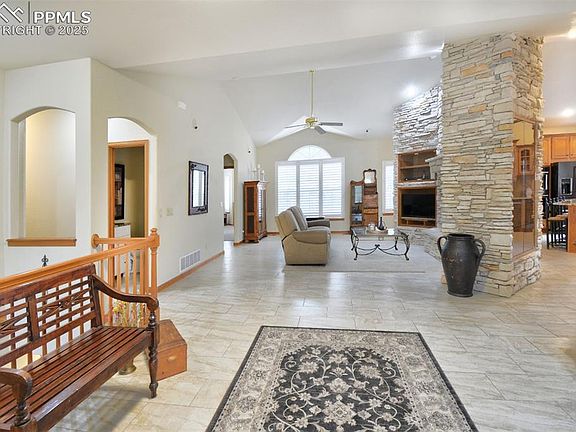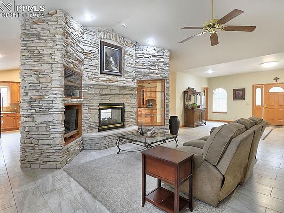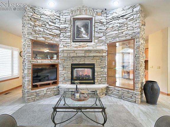 This stunning and private Ranch home in Woodmoor Highlands faces southwest and has a view of Pikes Peak while overlooking the 8th hole of the Woodmoor Golf Course. It sits on a large corner lot that offers privacy from neighbors and a peaceful setting among pine trees, all while enjoying beautiful views! The main level showcases windows with plantation shutters and highlights a gorgeous double-sided stone fireplace that sits between the kitchen and living room. The spacious kitchen boasts six new black stainless steel appliances, including an induction stove, double oven, and beverage cooler, and features granite countertops and island seating. The master suite is a private oasis, featuring a stunning bay window, adjoining master bath that is a true retreat with a new tile shower and bathtub, and two walk-in closets (both with rich cedar flooring). The finished walk-out basement features a stone fireplace in the expansive family room, a wet bar, and two spacious bedrooms with a Jack-and-Jill bath. The home features a sprinkler system, French drainage system with a sump pump, new Fibercon Composite wrap around deck with black railing, and has recently undergone fire mitigation approved by the US Forest Service. This home has been meticulously maintained!