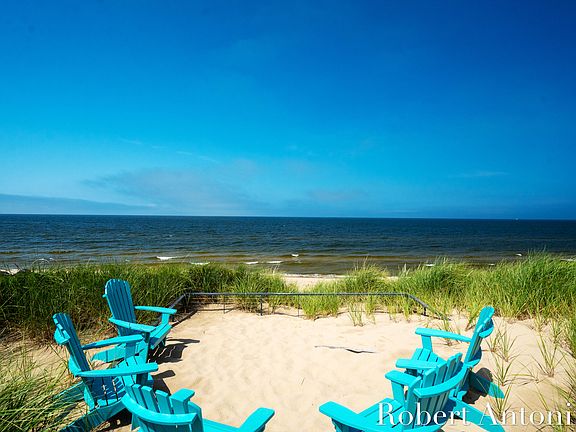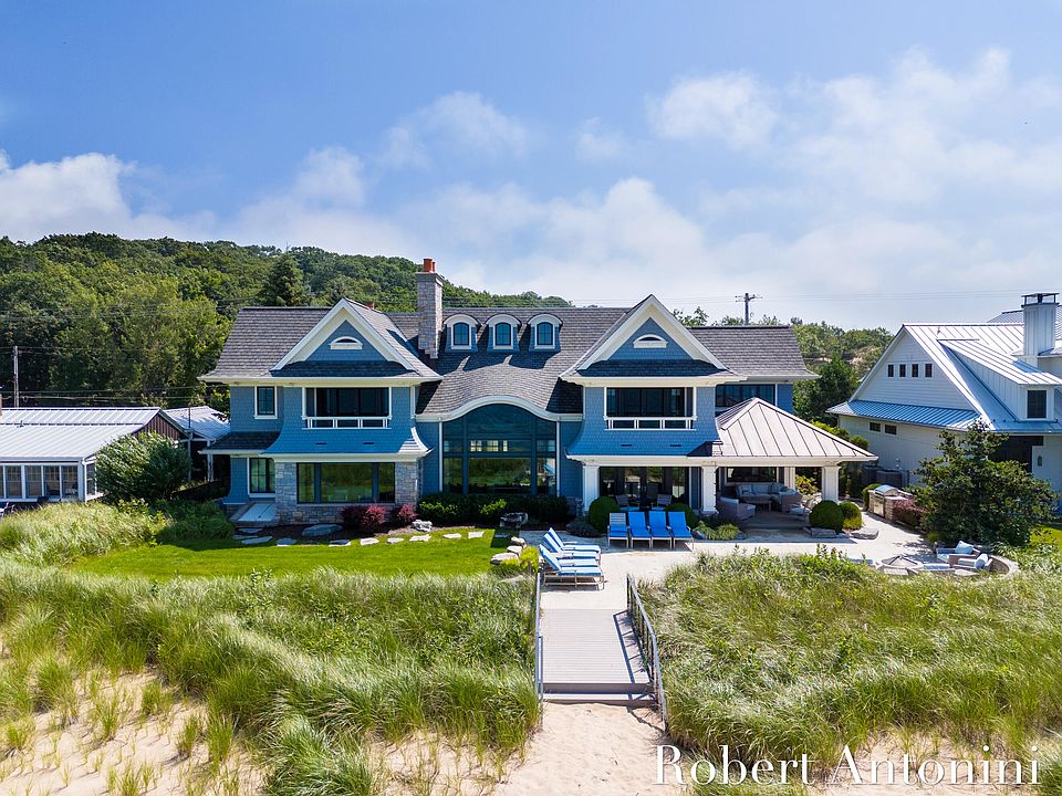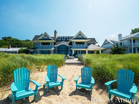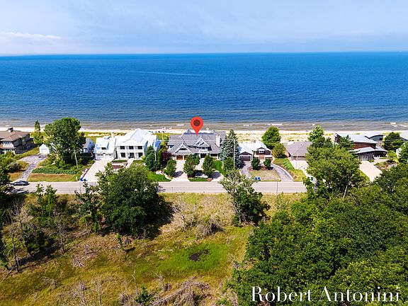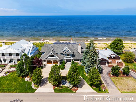 Introducing for the first time, North Shore in Spring Lake stands as one of the most coveted residential waterfront communities along Lake Michigan in West Michigan. Presenting an exceptional and award-winning Nate Vander Male Custom Home featuring 100 feet of private waterfront frontage. The collaboration of the architect, designer, and owners resulted in a meticulously crafted home where every detail has been thoughtfully considered. Multiple lakefront living patio areas offer a perfect setting for evening fires in the firepit complemented by an exclusive covered patio with phantom screens for enjoying breathtaking lakefront sunsets. The layout of the home exudes a superior level of finish and creates a welcoming and calming atmosphere. Each space within the home, from the spacious kitchen to the great room with a stunning fireplace, hearth room, and upper level, has been strategically designed to serve as central gathering spaces. The master suite offers fireplace, built-ins & custom bed w/built in lift TV. The bedroom provides stunning views of the lake, offering a serene retreat to observe the rolling waves. The entire home has been designed to capture panoramic waterfront vistas, with every aspect meticulously crafted by a skilled furniture designer, including the cabinets, baseboard trim, range hood, office, and even an elevator, tailored to suit the unique requirements of the property including a home generator.