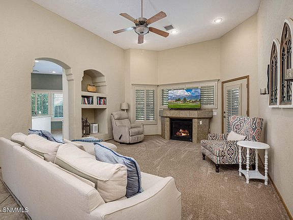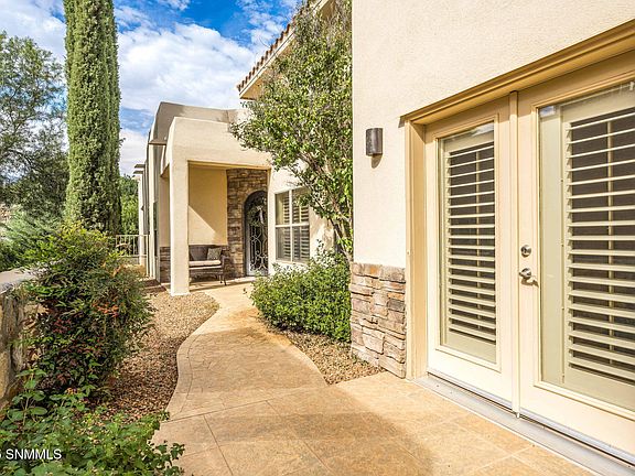 Welcome to this inviting Sonoma Ranch home offering 1,999 sq ft of comfort and Southwest charm. A peaceful front courtyard welcomes you with beautiful stonework and greenery, setting the tone for what's inside. The flexible floor plan offers 3 bedrooms plus an office or 2 primary suites plus office if desired. Enjoy high ceilings in the living and dining areas, plantation shutters throughout, and a cozy fireplace that adds warmth to the open layout. The kitchen features an electric cooktop, ample counter space, and easy access to outdoor areas. Step outside to the backyard, where a fountain and firepit create a tranquil setting surrounded by lush landscaping. From the front bedroom, take in stunning Organ Mountain views. Located just minutes from golf, shopping, dining, medical, and fitness centers, this home combines comfort, convenience, and style in one of Las Cruces' most desirable areas.