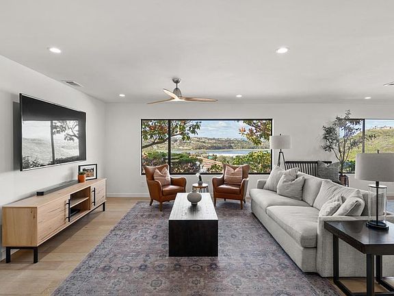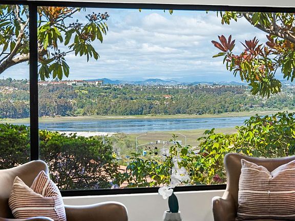 Welcome to this STUNNING like-new construction cul-de-sac home with panoramic lagoon & mountain views from nearly every room in the house! Completely remodeled from top to bottom in 2020, this spectacular home is the perfect marriage between luxury design & contemporary style. Every detail in this home’s redesign was carefully curated, from the gorgeous French Oak hardwood flooring to the marble countertops throughout. Step inside the mahogany entry door & be greeted with breathtaking panoramic water & mountain views that beautifully frame the back wall of the expansive great room. The designer chef’s kitchen boasts a collection of high end appliances for the cook in the family, from the “smart” refrigerator to the induction cooktop, wine cooler, double electric oven and additional built-in two-drawer refrigerator. The oversized kitchen island with 5-seat countertop stools carries you seamlessly into the dining space with electric fireplace for those cozy holiday dinners at home. The built-in office desk gives you a “front seat” view by day as you work, while the deck’s in-ground hot tub allows for a more intimate evening space to take in sunsets over the water. The primary suite boasts stunning views from both the bedroom & bathroom. Choose to enjoy your morning coffee on the deck just outside the bedroom or from the bathroom’s oversized soaking tub. Unwind in the steam shower before reading the morning newspaper while watching the sunrise off the front wrap-around patio deck framed by palm trees in true California style. The primary bedroom also features a fully-designed walk in closet and is conveniently located next to an oversized laundry room with ample linen cabinet storage. In addition to new interior & exterior paint throughout, the home boasts all new systems, including a new furnace, AC, water heater, electrical panel and new whole house water filter. House sits on a charming & quiet cul-de-sac street, is less than a mile to the beach and only minutes to downtown Leucadia’s favorite shops, restaraunts and sites. No HOA, top schools and quick freeway access for those commuting, this location is incredible! Tour today and experience the quintessential coastal California luxury lifestyle that makes Leucadia such a coveted place to live!