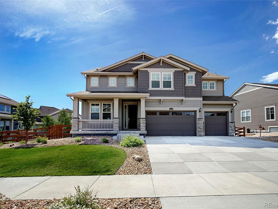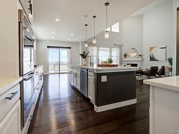 The living room is highlighted by dramatic ceiling heights, a cozy gas fireplace, and expansive windows that frame views of the large balcony and lush backyard. Outside, the resort-style backyard is a showstopper — featuring a three-hole putting green, vibrant flower gardens, and thoughtfully designed landscaping including French drains, buried gutter spouts, and a retaining wall that creates a large, flat play area. Custom stone steps connect the generous side yard to the front, where raised vegetable garden boxes are ready for planting. An additional deck was added to create covered storage below and a private space above to relax and take in the sweeping views of Standley Lake, downtown Denver, and summer thunderstorms rolling across the sky.