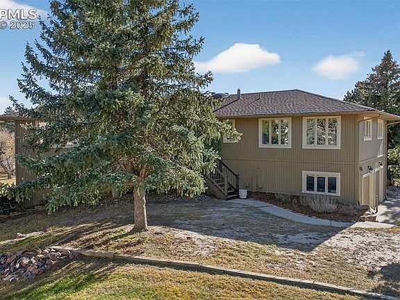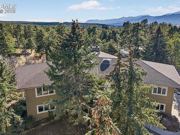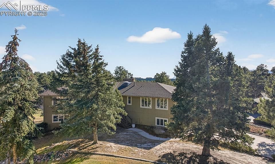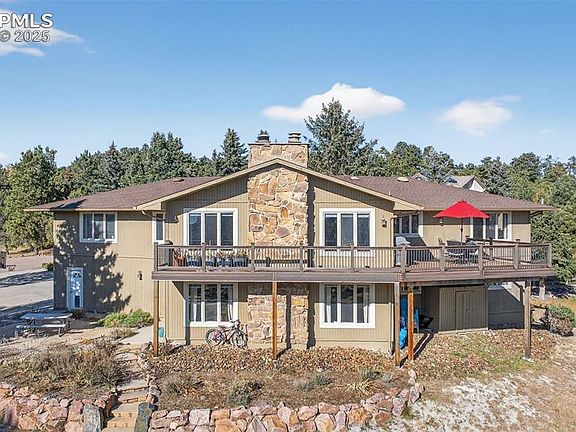 Gorgeous home in a quiet cul-de-sac in Woodmoor on over 3/4 of an acre and has views of The Peak and front range! Enter this wonderful home from the composite deck and through the covered welcoming entry and into your own paradise! Real wood floors throughout the spacious main living areas, to include the living room, flex space, dining room, kitchen and family room! Many large windows bring in tons of fresh light and provide the feeling of living among the trees! The kitchen has custom cabinets, granite counters, stainless steel upgraded appliances and views! The kitchen opens to the vaulted family room with more beautiful wood floors, beamed ceiling and full height stone fireplace! Walk out from the family room and second eating area to your private oasis with mature trees, composite deck and views of the mountains, including Pikes Peak! The dining room is large and gives you room to have many guests for the holidays! The front living room and flex space provide a quiet sitting area and space for an office or study space! A main level private master bedroom rests at the end of the hallway for your own space to relax and enjoy more views! Private master onsuite bath has two sinks with a window, large shower and space for getting ready in peace! Walk in closet as well! A large secondary bedroom has more views and the spacious full bath has two more sinks, quartz counters and many updates. The walkout basement is huge, with another stone fireplace, no window wells and two large bedrooms! Basement has another large full bath and a dream laundry with upper and lower cabinets, sink and folding area! All this with an oversized garage and flag stone patio for a fire pit, large very private yard and a very peaceful setting! Walk over the Woodmoor Country Club for golf or time at the pool! You are going to love living here!