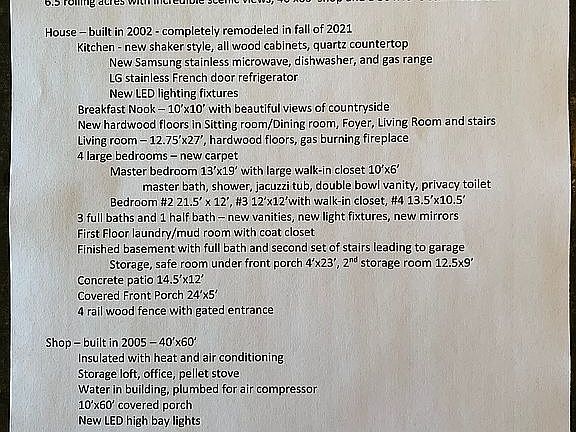 19299 Collier Ridge Road Guilford, IN 47022 $595,000.00 2368 Ft2 finished with an additional 800 Ft2 finished in the basement – total finished 3268 Ft2 6.5 rolling acres with incredible scenic views, 40’x60’ shop and a 30’x40’ 6 stall horse barn House – built in 2002 - completely remodeled in fall of 2021 Kitchen - new shaker style, all wood cabinets, quartz countertop New Samsung stainless microwave, dishwasher, and gas range ??LG stainless French door refrigerator ??New LED lighting fixtures ?Breakfast Nook – 10’x10’ with beautiful views of countryside ?New hardwood floors in Sitting room/Dining room, Foyer, Living Room and stairs ?Living room – 12.75’x27’, hardwood floors, gas burning fireplace ?4 large bedrooms – new carpet ??Master bedroom 13’x19’ with large walk-in closet 10’x6’ master bath, shower, jacuzzi tub, double bowl vanity, privacy toilet ??Bedroom #2 21.5’ x 12’, #3 12’x12’with walk-in closet, #4 13.5’x10.5’ ?3 full baths and 1 half bath – new vanities, new light fixtures, new mirrors ?First Floor laundry/mud room with coat closet ?Finished basement with full bath and second set of stairs leading to garage ??Storage, safe room under front porch 4’x23’, 2nd storage room 12.5x9’ ?Concrete patio 14.5’x12’ ?Covered Front Porch 24’x5’ ?4 rail wood fence with gated entrance Shop – built in 2005 – 40’x60’ ?Insulated with heat and air conditioning ?Storage loft, office, pellet stove ?Water in building, plumbed for air compressor ?10’x60’ covered porch? ?New LED high bay lights Horse Barn – built in 2014 – 30’x40’ ?6 stalls with manufactured metal stall fronts ?Lead out runs with 2 grazing areas Contact Vince Karsteter, 513-382-5418