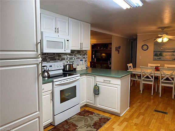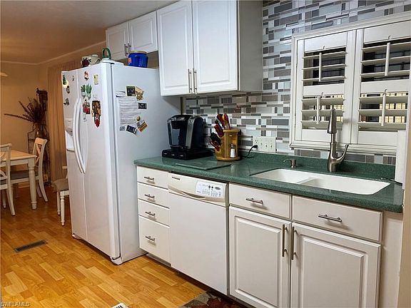 Beautiful 3 BR/2 BA plus 2 Florida Room home being offered turnkey. This charming home is situated on a corner lot with nice curb appeal and plenty of parking space. It has been remodeled and will be a fabulous find for someone who wants to move right in and start enjoying the Florida Lifestyle. Spacious kitchen with newer appliances, lots of cabinets and a breakfast bar. The backsplash is done with linear mosaic tile in gray/white. HVAC is 2018. Inside laundry room with Washer and Dryer. Plantation Shutters on most windows. Large Utility Shed/Workshop Area has lots of storage space with an extra Refrigerator/Freezer. Vinyl siding and awnings around home for storm protection and shade. Golf Cart included. Located in desirable Carriage Village which is 55+ community. OWN YOUR LAND and maintenance fee is only $77/month. Pet Friendly. Community has a large heated pool, clubhouse, hobby shop, library, shuffleboard, bocce ball, putting green, activities and much more.