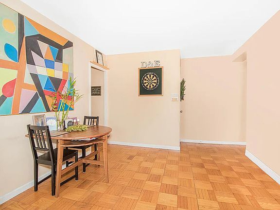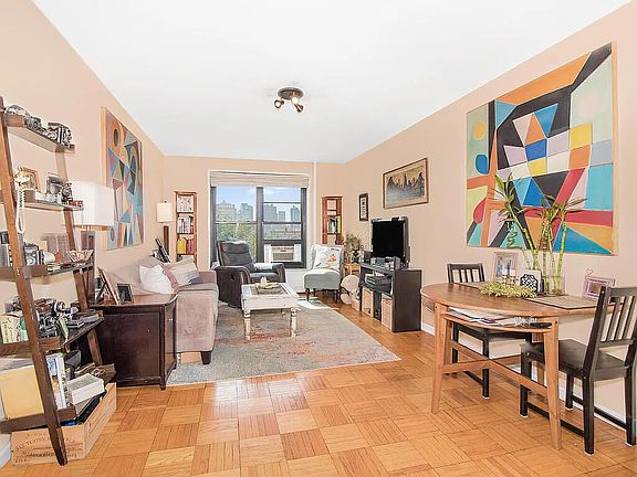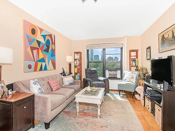 The apartment offers stunning views of the Manhattan skyline, as well as townhouse architecture and greenery. The building is pet-friendly, has two elevators, a laundry room, 24-hour security, bike storage, a live-in super, and a beautiful common courtyard with expertly manicured lawns. The building allows subletting, guarantors, pied-a-terre, co-purchasing and 10% down payment.