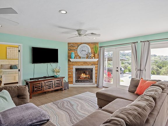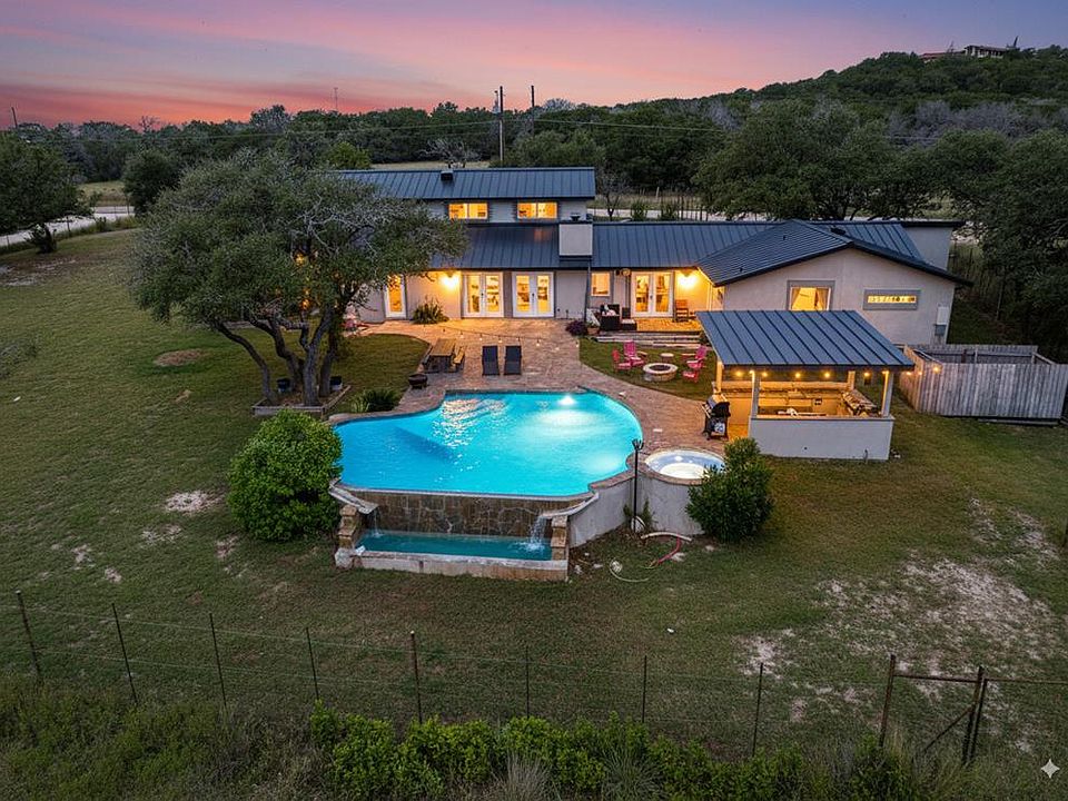 Experience modern luxury and ultra-cool, colorful design in this spacious, custom-built 3-bedroom, 2.5-bath home, perfectly positioned on 5 beautiful, private acres just outside Kerrville's city limits. Currently operating as a successful VRBO for the last 8 years, the property is being sold fully furnished but can also serve as a magnificent full-time residence. With over 3,000 sq ft, the home is a trend-setter's dream, featuring a spacious kitchen with black galaxy granite & a stainless gas stove, all complemented by an open floor plan. The layout includes a large master suite with a slate walk-in shower for two, a guest bedroom and full bath downstairs, & a second bedroom and half bath upstairs. The 2.5-car heated and cooled garage is currently utilized as a game room. The unparalleled outdoor space is an entertainer's paradise, boasting a flagstone patio, an infinity pool & hot tub, & a fire pit, where you can enjoy beautiful starry nights & local wildlife. The home is topped with a new standing seam roof with a transferable warranty, & its prime location offers lower county taxes, close proximity to Kerrville's shopping and dining, & a convenient drive to Fredericksburg & SA