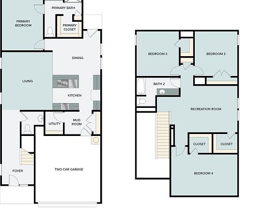 First-floor foyerSemi-private water closetUpstairs recreation spaceWalk-in closetCenter islandWarm shaker-style cabinetry