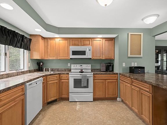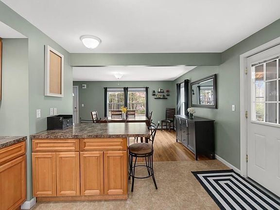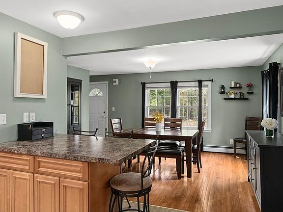 Ready to move in to this spacious home with open kitchen/dining room concept with breakfast nook, all appliances stay, updated cabinets, hardwood floors in the dining and living room, 1 bedroom and office/playroom off the back hall on the first floor with wall-to-wall carpeting, and a full bathroom with updated fixtures. The second floor features 2 additional bedrooms and a full bathroom. Enjoy the enclosed porch overlooking the flat side yard. 1 car detached garage, carport and storage shed all in one! Great level backyard perfect for entertaining and enjoying the summer weather. Newer (approx.2009) siding, windows, roof, heating system, oil tank! Don't miss this one!