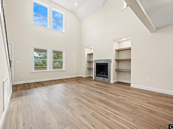 Step inside to an inviting, open-concept layout featuring a dramatic two-story great room. You'll love the natural light pouring in through soaring windows, the elegant granite gas fireplace, built-in shelving, and ceiling fan—offering a warm, welcoming space for family and guests alike.