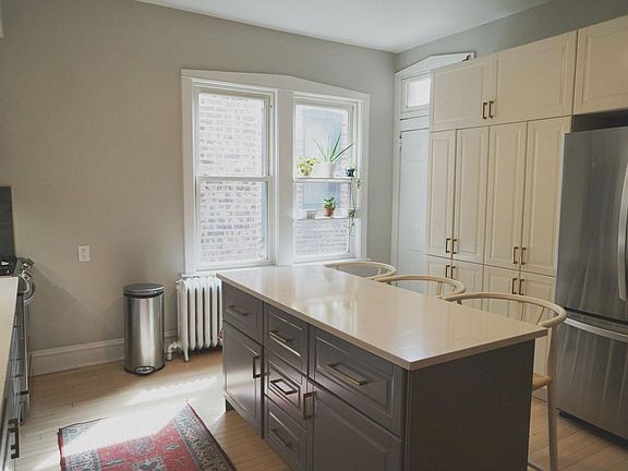 Dream apartment for someone who's looking for upgraded finishes in a historic gray stone building. This is the owner's unit, second-floor apartment located on a residential tree-lined street in Logan Square/West Bucktown. FREE HEAT!! You will save hundreds on heat in the winter. Minutes from popular bars and restaurants (Middlebrow Bungalow, Parsons, Lonesome Rose, Table Donkey & Stick). 8 minute walk to CTA Blue Line - Western stop. 3 minute walk to Bloomingdale Trail. Upgrades in the past year: -Brand-new kitchen with premium LG appliances and undercounter lighting -Brand-new bathroom with premium fixtures and backlit mirror -Refinished floors & trim -New entryway carpeting Other info: -Shared coin-laundry in basement with commercial laundromat-style front-loading washers -Free heat -Window A/C units provided -Easy street parking (no permit) -Private back deck for unit only -Shared backyard Owner pays for water and heat is included. Tenant pays gas and electric. First month's rent plus one-month deposit due prior to move in. No smoking.