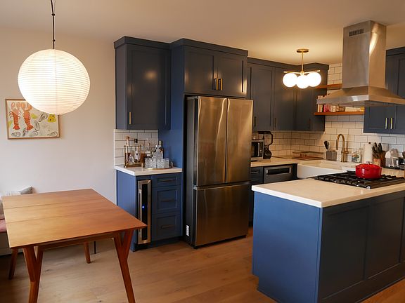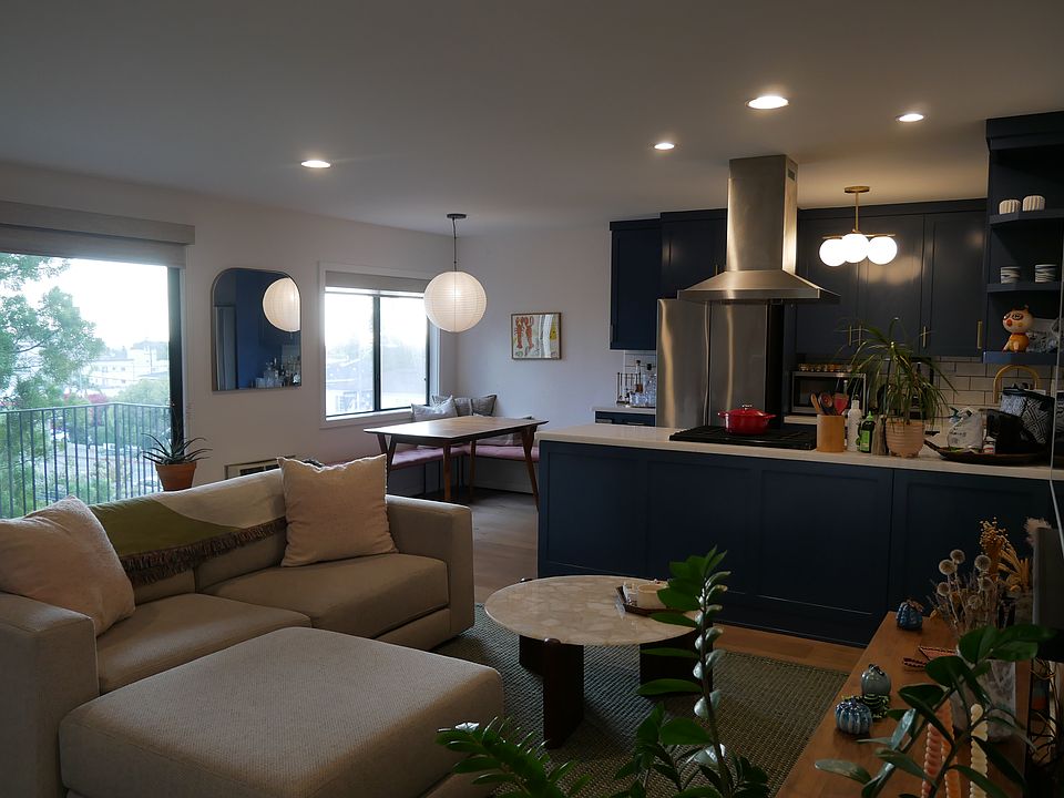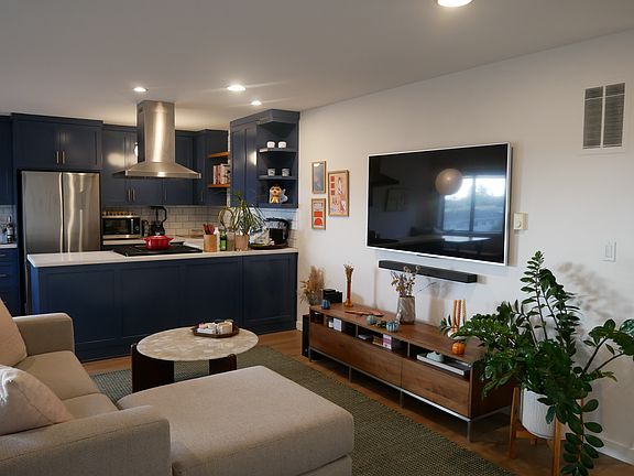 1930 North Vermont Ave #303 is a newly renovated 1 bedroom 1 bathroom condo in the heart of Los Feliz. Bright with natural sunlight from its large window and sliding glass balcony doors, the unit is on the third floor (of 3 floors) of a quiet 30-unit condominium complex with a lush tropical plant courtyard at the center. The unit features an open concept kitchen, dining room, living space, nook (perfect for work from home set-up), bathroom, and bedroom large enough for a King bed + additional furniture. The modern kitchen has a 5-burner gas stovetop with attached oven, dishwasher, farm sink, new french door refrigerator (with water dispenser and pebble ice maker), and a 6-bottle wine cooler. It also features blue cabinetry with gold hardware and white marble countertops. The bedroom boasts a large built-in custom closet, as well as blackout shades. In the bathroom is a soaking tub and rain shower head for ultimate relaxation. Off the living room is a private balcony with a lush green tree nearby for added seclusion, plus a partial view of the city. Additional features include: air conditioning units in the living room and bedroom, a heater, and two in-unit storage closets. Laundry and bicycle storage are available in the basement. One covered parking spot in a private basement garage and additional ample street parking. The building is monitored by Post Security for added safety. Walkable neighborhood close to all the restaurants, bars, and shops in Los Feliz. Pets allowed with prior approval and deposit. Tenant pays for gas, electric, and internet/cable. Renter's insurance is required. First month's rent and security deposit required at time of lease signing. 12 month lease. No smoking.