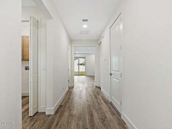 Designed with both efficiency and safety in mind, the property features a hip roof to help reduce insurance costs and PGT hurricane-impact windows for added protection. High-end finishes include quartz countertops, luxury vinyl plank flooring throughout, custom tile in the master and guest bathrooms, energy-efficient LED lighting, push-button illuminated vanity mirrors, and sleek, natural wood-toned cabinetry.