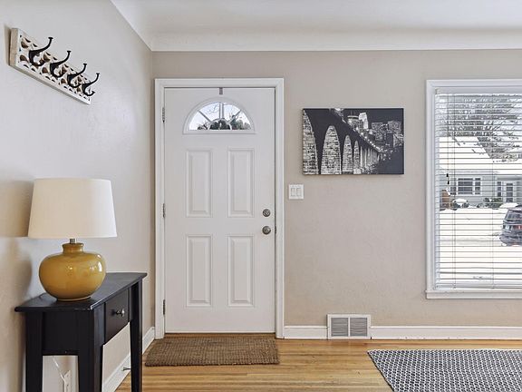 This is a super sweet 1.5 Story, Cape Cod home in a very convenient St. Paul neighborhood near amenities and freeway access. Upon entering you're greeted by beautiful Cove ceilings, arch doorways and Oak hardwood flooring that lead into the spacious southern exposed, light-filled living room. Just down the hall are the two main floor bedrooms that flank a fully tiled bath. Through the archway is the Eat-in-Kitchen that overlooks the patio and fenced backyard. New Stainless Steel appliances outfit this spacious kitchen with floor-to-ceilng painted white wood cabinets, sturdy laminate countertops with stylish backsplash, peninsula breakfast counter, freshly painted walls and tiled flooring. Upstairs is the lovely large Owner's Suite with carpeted flooring, two spacious closets and open sitting area! The basement is a clean slate and a great opportunity to build equity! Bonus pts. for: Central Air, newer windows, new appliances and a great fenced backyard w/patio! This is a great value!