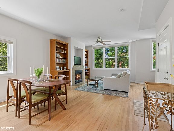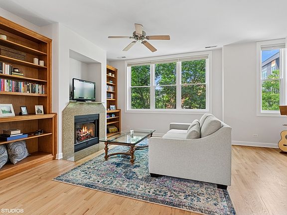 Bathed in natural light and surrounded by tree-lined views, this extra-wide corner 2 bed, 2 bath home sits in a prime Logan Square location. The spacious open floor plan offers generous living and dining areas, a large kitchen, and a flexible nook-perfect for a home office, reading lounge, or expanded seating area. Southern-facing windows overlook a lush neighborhood street, while inside, custom built-in bookshelves, a cozy gas fireplace, hardwood floors, and tall ceilings add warmth and character. The kitchen is outfitted with tall wood cabinetry for excellent storage, granite countertops with a breakfast bar, and stainless steel appliances. The bright and airy primary suite features an organized double closet, private balcony, and ensuite bath. The second bedroom is also well-sized with built-out closets for added storage. Recent updates include: water heater (2023), washer/dryer (2023), refrigerator (2023), A/C (2021), and furnace (2014). One gated parking space and additional storage included. Unbeatable location-just minutes to the Blue Line, multiple bus routes, the 606 Trail, and quick expressway access. Enjoy easy walks to Logan Square, Bucktown, and Wicker Park's top-rated restaurants, bars, cafes, and boutiques. Pet- and investor-friendly building makes this home a smart choice for homeowners and landlords alike.