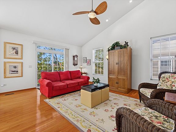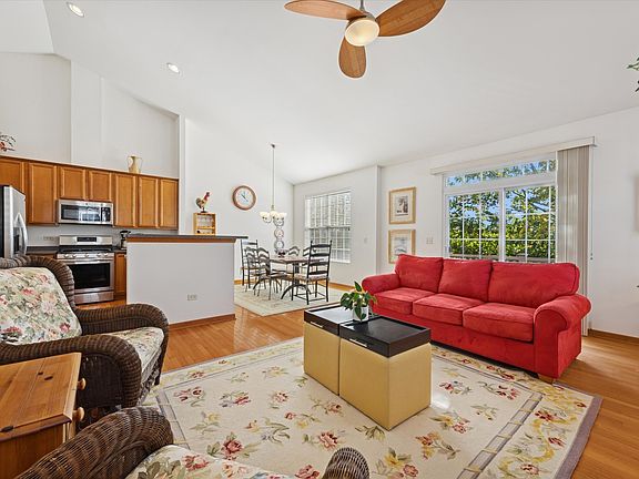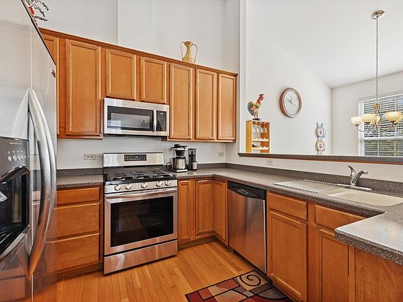 Welcome to this prime, end-unit residence located in highly desirable North Naperville. This bright, airy townhouse offers 3 bedrooms and 3 full baths, along with generous living spaces and abundant storage. Vaulted ceilings and natural light create an open, inviting atmosphere throughout the main level. The spacious kitchen flows seamlessly into the large dining and living areas-perfect for everyday living or entertaining-while a private balcony offers peaceful views of the treetops and pond. Beautiful oak floors run throughout the main floor, enhancing the home's warmth and character. The primary suite serves as a true retreat, featuring double vanities, a separate shower, whirlpool tub, and an expansive walk-in closet. The light-filled lower level expands your living options with a welcoming family room, a third bedroom that also works perfectly as an office, a third full bath, laundry room, and direct access to the oversized two-car garage. Complimentary guest parking available onsite, as well as a common picnic area with volleyball court. Commuters appreciate the unbeatable location near the Metra and major highways, while nearby shopping and dining offer convenience for everyday life. Served by top-rated Naperville schools, this meticulously maintained home features a newer roof and is truly move-in ready.