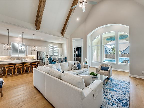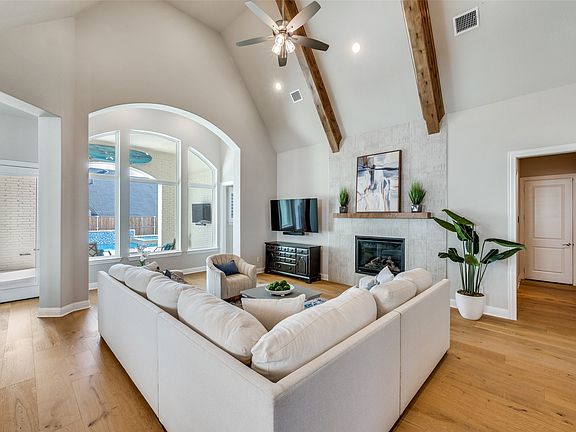 Discover this highly sought-after, north-facing residence, where elegance meets comfort. Insise you will find exquisite white oak floors that stretch throughout the home, setting a refined tone. The heart of the home features an open-concept floor plan, and soaring ceilings adorned with rustic wood beams. A magnificent floor-to-ceiling fireplace serves as a stunning focal point. Thoughtful incorporation of natural wood elements throughout the house infuses warmth into this bright and airy living space, creating a welcoming atmosphere. Culinary enthusiasts will delight in this kitchen equipped with a gas cooktop, state-of-the-art stainless steel appliances, and a charming farmhouse sink. A generous island provides ample space for meal preparation and is ideal for gatherings and entertaining. The kitchen seamlessly connects to both the media room and the expansive family room. This home features a media room conveniently located on the ground floor. Retreat to the primary bedroom, a sanctuary featuring a wall of windows that fill the room with natural light, complemented by elegant shutters throughout. The luxury primary bath is designed for ultimate relaxation,with rich wood finishes and abundance of storage, with a free-standing tub. The primary closet is a spacious walk-in, offering direct access to the laundry room. Step outside to a large covered patio, complete with spacious decking, ideal for outdoor cookouts and enjoying the sun. The expansive lot offers a private oasis, featuring a resort-style pool and spa, promising endless relaxation and entertainment possibilities. Upstairs, a large loft provides a versatile space, perfect for a teen retreat, dedicated second office, or a flexible room to suit your needs. For ultimate comfort and privacy, all bedrooms in this home are ensuites, ensuring no sharing of bathrooms.Residents enjoy resort-style amenities, sparkling pools, tennis,pickleball courts, playgrounds, lakes, & miles of tree-lined walking trails.