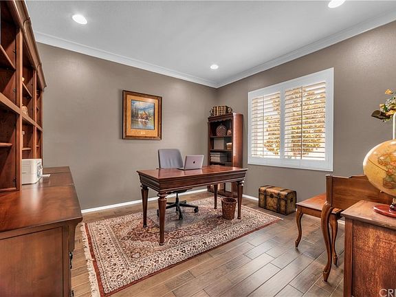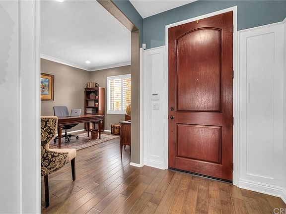 Gorgeous former model home with all the beautiful finishes! NO Mello Roos! This home has lovely engineered hardwood floors throughout the downstairs and upgraded carpeting. Beautiful wood panel entrance and designer paint throughout contribute to the charm of the home. Convenient main floor bedroom and full bathroom. Crown molding downstairs and in the master bedroom. Kitchen is open to the large family room, perfect for entertaining. This home has a paid for solar system helping to offset the energy costs as well as a dual zone AC unit. This home also has fiber optic cable available which enables 1GB Internet speeds, great for working from home! A tankless water heater & sprinklers that can be controlled from your smart phone! Tandem 3 car garage has epoxy floors, an insulated garage door, storage cabinets & a work bench. Fantastic covered patio with a fireplace and the TV is included with the home! Granite built in BBQ bar, perfect for enjoying the fabulous view! HOA offers a great community pool. Just down the street is a huge city park with basketball courts, playground and ample grassy space. Also there is a brand new Skyline Plaza offering a variety of restaurants. This community offers award winning schools as well.