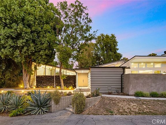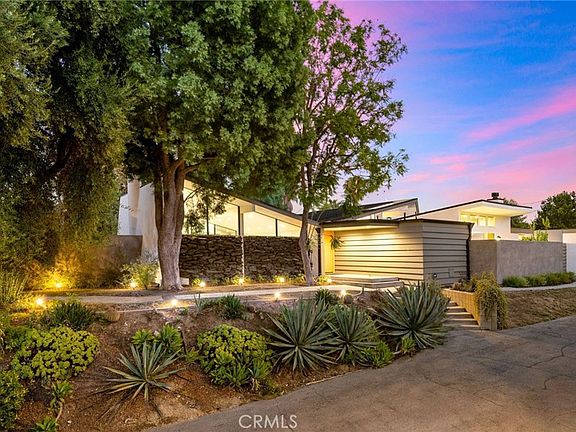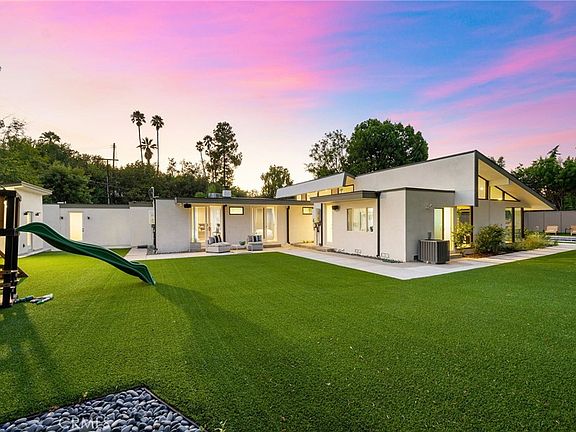 Stunning mid-century modern home in a prominent enclave of Tarzana. Inviting curb appeal with gated entrance welcomes guests through an covered entrance to open floor plan with beautiful finishes throughout. Meticulously remodeled, the property has spacious common areas with pitched ceilings, geometric windows and wood and tile floors. A large living room showcases a stunning fireplace and floor-to-ceiling glass doors and windows that open to an entertainer's backyard. A Gourmet Chef’s kitchen comes with beautiful stone counters, stainless steel appliances, and a large breakfast bar adjacent to the spacious family room and dedicated office. The exquisite primary features access to a private exterior jacuzzi, walk-in closet, and spa-like master bath with soaking tub, open glass shower, and dual vanity. A state of the art movie theater and guest rooms complete the main sleeping quarters perfect for family and friends. A private entertainer's yard has a sparkling pool and covered wood patio perfect for entertaining. The backyard also features tremendous amounts of side yards with extra entertainment areas, an exterior en-suite casita and detached pool house. Enjoy everything Tarzana has to offer, located near shops, restaurants, and more!