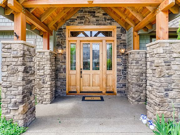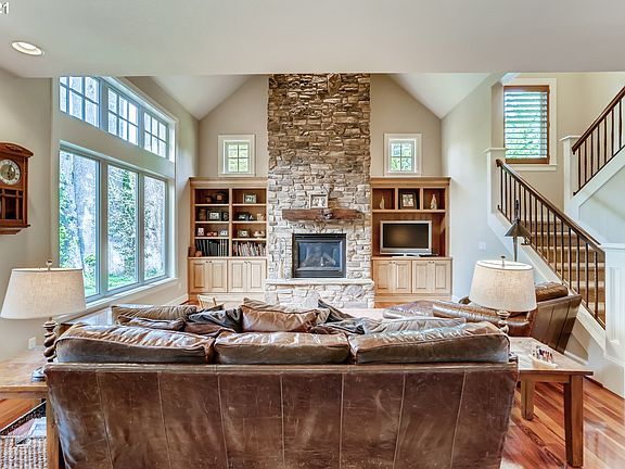 The perfect retreat-in & out. NW inspired stone & timber custom home on cul-de-sac in Lake Oswego premier schools. 1st main foor bedroom&bath, media room, w/loft and 4 berms up.Expansive windows,vaulted ceiling,wood beams,wrought iron rails,hardwood floors,floor-to-ceiling stone fireplace,Built-ins in great rm & office accent this move-in ready home. Open 1st floor Covered outdoor living w/new Weber grill, sink, bar & wood-burning fireplace in landscaped fenced, private yd w/irrigation,3 car gar