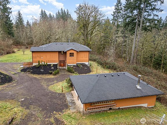 A private retreat on 9 acres, minutes from Duvall in the desirable Cherry Hill neighborhood. This stunning home offers an open-concept design boasting soaring ceilings, sunrooms featuring expansive windows, abundant natural light and hardwood floors. French doors lead to an entertainment-sized covered deck, seamlessly blending in/outdoor living and a dedicated space for office, studio or gym. New appliances throughout,AC, fresh paint, carpet, Lutron lighting and countertops. 980sf 4 car garage w/ EV Charger and water for potential ADU. Shop, private well with new 2-stg whole house filter, pastures and dog run. This property combines privacy, modern updates and natural beauty—a perfect place to call home. Ask about 1% off special financing!