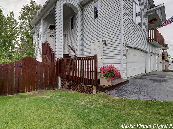 South Anchorage. Vaulted ceilings in spacious great room upstairs. Kitchen features higher end stainless appliances, large bar area, & pantry. Access from Dining to wrap around covered porch. Master suite on main living level. Beautiful hardwood floors & inviting paint colors. Unfinished ground floor w/a lot of storage or remodel as you desire to add sqft for walkout basement to fenced backyard