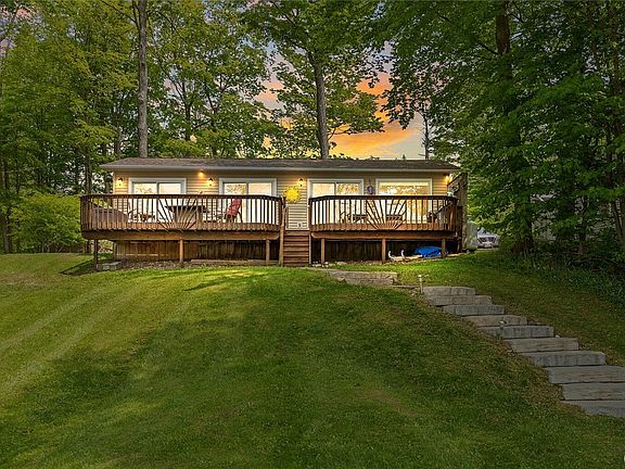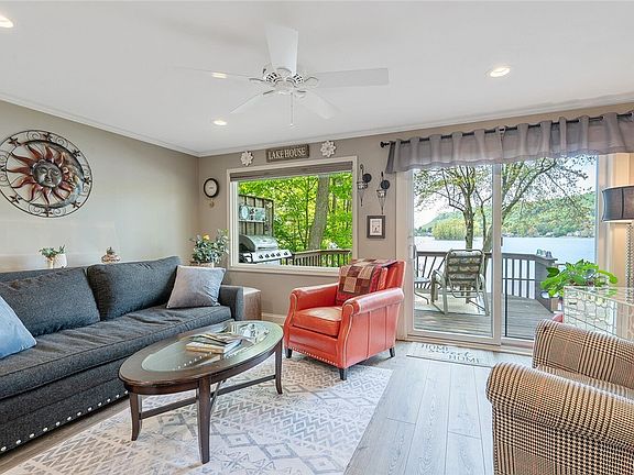 Discover the beauty of lakeside living in this extraordinary 2 bed, 1 bath year round ranch home! Great opportunity to own a Luxury 54’ waterfront retreat on Song Lake that combines natural beauty, modern comforts, and year-round recreational opportunities. Boasting an impressive lot w/an additional lot that provides parking w/6 spaces & a shed. New flooring throughout. Exceptional expansion of primary bedrm walk in closet & a wall removed to create the great rm, lg picture window w/recessed lighting & designer well-appointed newer kitchen w/granite countertops, soft close drawer cabinets, Center Island, SS appliances, integrated dishwasher, custom backsplash & copper hood, pendant lighting & pantry & washer/dryer. Partial basement for storage. Indulge in the tranquility of lakeside living on the expansive 38'x12' deck w/propane gas grill & fireplace sure to please. Enjoy easy access to the lake & 32' dock via the steps leading from the deck. Conveniently located just half a mile from Song Mountain Ski Resort & snowmobile trails, this home is close to exciting activities. Time to transform your lifestyle to fully embracing living the lakeside dream!