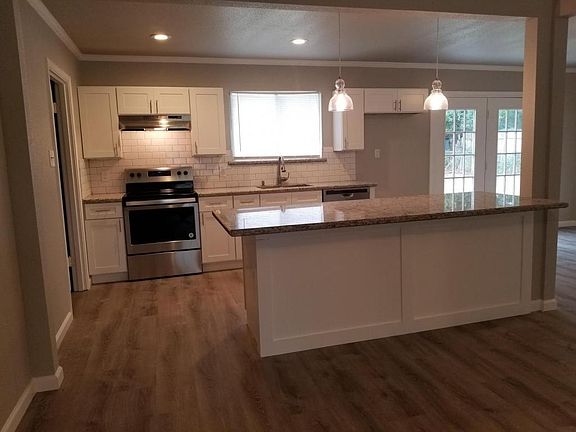 Open plan with central A/C and heat. Kitchen has eat-at island, granite countertops, stainless steel appliances. Laundry room with cabinet and walk-in pantry. 3 bedrooms with ceiling fans, walk-in closets. 2 car garage. Dining room with french door leads to fenced in back yard.