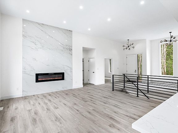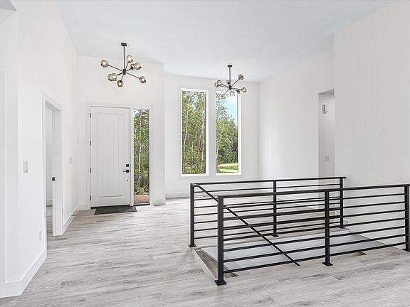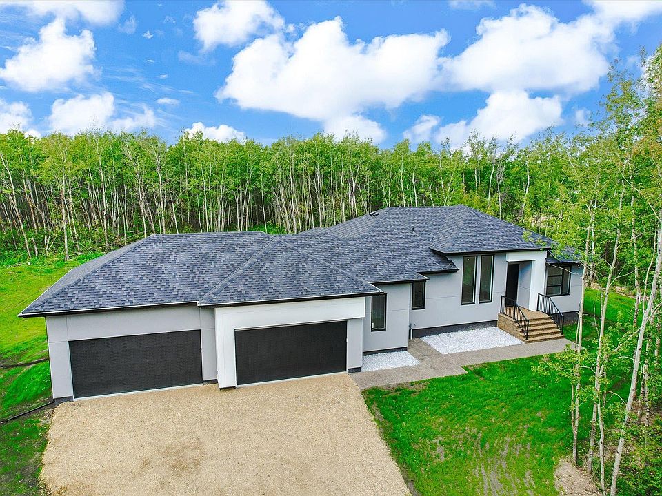 Newly built bungalow on a peaceful, tree surrounded corner lot in a paved subdivision, just 15 minutes from Tofield. This elegant home offers 12-ft ceilings, an open concept layout, and large windows that fill the living, dining, and kitchen areas with natural light. A striking linear fireplace with marble-style surround, stylish lighting, and ceiling-height custom cabinetry with quartz counters set the tone for modern living. The spacious island, corner pantry, and formal dining room make entertaining easy. A versatile den can serve as a third bedroom, while the primary retreat boasts a walk-in closet and luxurious 5-pc ensuite with soaker tub. Main-floor laundry is complete with sink, storage, counter space and access into garage. The unspoiled 9-ft basement with 5 big windows offers endless possibilities. The impressive quad attached garage includes two double overhead doors, floor drain, windows, and man door. Surrounded by mature trees, this property blends quiet country charm with modern comfort.