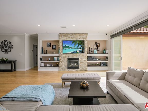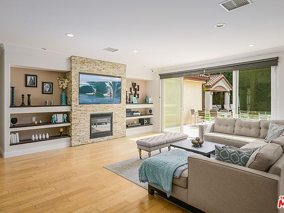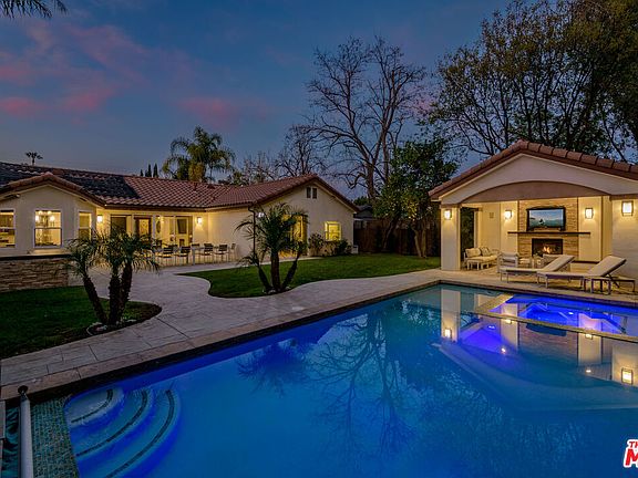 Built in 2011 and nestled in the highly sought-after Melody Acres on a quiet street, this timeless single story designer home combines style and modern convenience. Enter through custom double front doors into an inviting open great room. Natural light flows into the open living spaces large windows and doors. The kitchen, complete with built-in custom cabinetry, roll-out drawers, and a custom shaped island, is equipped with new appliances, including a dedicated desk and wine area. Designer light fixtures and natural stone countertops add a touch of refinement to this culinary space, which seamlessly opens into the great room. Highlighted by natural hardwood floors, rounded edges, and a beautiful fireplace, the great room is an inviting space for relaxation. The dining area flows and connects to the living area and kitchen. The grand primary suite, features a luxurious bathroom with a double vanity, jetted tub, stone floors, and a large shower adorned with natural stone slabs. This retreat boasts a built-in closet for ample storage. Four additional oversized bedrooms provide ample space that is befitting of much larger and expensive homes. The sprawling backyard is an entertainer's dream, with plenty of grassy area, a saltwater pool equipped with a safety pool cover, a chef's BBQ station with plenty of seating and top of the line appliances. This expansive backyard embraces the Los Angeles outdoor/indoor living with the help of a beautiful cabana with a Fireplace, TV, and seating galore. Additional amenities such as a driveway that has room for 6 cars, a Basketball hoop, trash area, electric car charging port, and ADT security system with window and door sensors offer practical enhancements to the property. It is within walking distance of a private school and neighborhood shopping. This home combines timeless charm with state-of-the-art amenities. This is a truly rare opportunity to make this turn-key, stunning home yours.