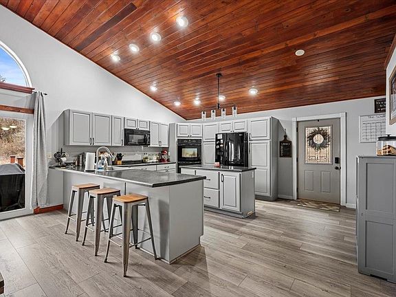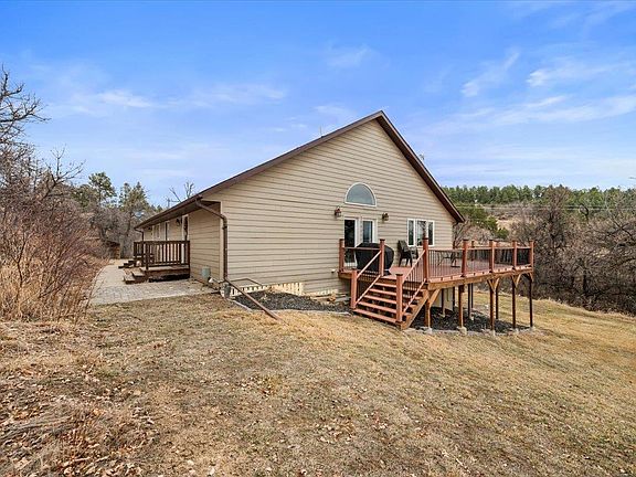 For more information, please contact listing agents Heath Gran 605-209-2052 or Scot Munro 605-641-6482 with Great Peaks Realty. Incredible 6-bedroom home situated between Spearfish and Belle Fourche nestled privately on 2.97 acres, this property has a secluded country feel while conveniently located just minutes from town! Enter the home into an open layout with vaulted, knotty pine ceilings and tons of natural light, updated LVP floors and fresh paint throughout! You will love the wrap around deck that can be accessed from any area of the main level. Large laundry/mudroom just inside from the garage. Primary ensuite is featured on the main level that steps out onto the deck with stunning views in every direction plus wonderful bathroom with a soaker tub, double sink vanity and walk-in closet! The spacious walkout basement offers a large family room with a theatre screen, 4 bedrooms and large bathroom with TWO double vanities! This property is privately nestled up against the wooded hillside, surrounded by trees for ideal privacy and a seasonal pond. Carport has been added for additional parking or storage. You won’t want to miss out on this exceptional property!