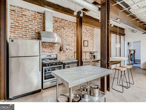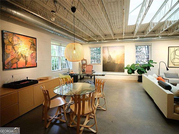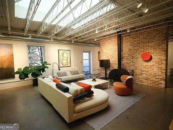 Nestled into a hill surrounded by a manicured landscape, this unique custom condominium residence is a light-filled dream. The massive 10 ft. square skylight, windows on 3 sides, entry foyer, along with the 2 exterior glazed doors, surround a large gallery-like setting for furniture, artwork, entertaining, and a live/work opportunity. Created by an award-winning International designer, Unit C is one of only 3 residences within a single story brick building in the sought-after Lake Claire neighborhood. And just a short walk down the street, between 2 parks, are the neighborhood market and 3 restaurants. The Industrial-chic interior of this home with soaring ceilings is highlighted by a sculptural wood-burning fireplace set against a feature wall of vintage mill brick with 2 portals to the bedroom behind. There are custom full height translucent steel-framed sliding doors throughout the space, a bank of which front a large pantry/closet adjacent to the open kitchen. A "surfboard" custom high-top sets the tone for casual dining at the kitchen, which is equipped with stainless appliances, gas range, range hood, and polished Calacatta marble front island counter. Step into the gorgeous 4-fixture bathroom, tiled floor-to-ceiling with a rare Vermont mottled slate, creating a soothing refuge with free-standing artisan soaking tub, open shower, euro toilet, and a cast stone vanity with custom lighting. The large bedroom again features a vintage mill brick wall, windows to the back terrace, and a walk-in closet. The Lutron lighting scene control panel is at hand here. As you make your way back out the front through the foyer, you pass the separate laundry/utility room with Included washer and dryer. There is a relaxing patio/lounging area at the entry, and a private side door from the living room with steps into the gated rear area. With a granite-paved terrace for grilling within the fenced back yard...very dog friendly...these outdoor features combine to create a truly unique residential experience.