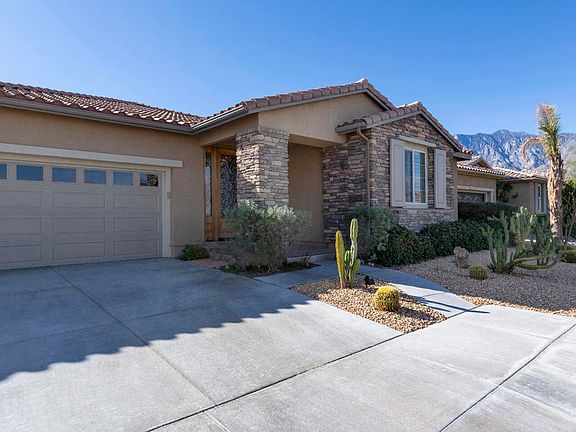 Discover this upgraded Mediterranean-style home in Four Seasons, Palm Springs' premier 55+ community, offering stunning mountain views, owned solar, and an ideal location near the clubhouse. This immaculate 2,825 sqft, 2 bedroom, 3 bath home is perfect for those seeking move-in ready luxury that is both comfortable and provides the benefits of living in an active adult lifestyle neighborhood.Designed for both formal and casual living, the open floor plan features a vaulted dining room and a spacious main living area. French doors open to the covered backyard patio, which boasts mountain views, an artificial lawn, and a BBQ station.The chef's kitchen includes a large prep island, bar area, pantry, and high-end finishes like slab granite counters, wood cabinetry, and a stainless steel appliance package. It is open to the family room, which features a stacked-stone gas fireplace and additional access to the backyard patio.There are two en-suite bedrooms. The rear, primary bedroom has backyard access, a gas fireplace, two walk-in closets, and a spa-style bath with a soaking tub. The front bedroom suite is adjacent to a den/media room, offering the flexibility to be used as a casita-style retreat. The den could potentially be converted into a third bedroom, with the en-suite bath becoming a Jack-and-Jill layout. The home also has built-in speakers, 2 newer HVAC systems that were installed in 2021, a hot water heater installed in 2020, and a water re-circulator.
