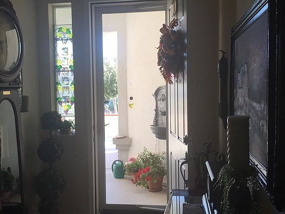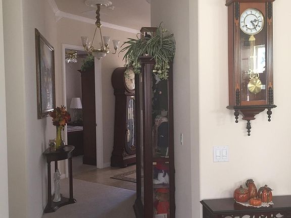 You will love this Juniper Model with many custom upgrades, including a gated front courtyard, glass storm door at the entry and custom crown molding in all rooms. The kitchen has a beautiful tile backsplash and rope wood moldings added to the cabinets, the frosted glass pantry door adds great character. Additional cabinets and drying pole have been added to the laundry room. The dining area features beautiful stain glass windows and the living room fireplace has a custom mantel. Built in bookcase and cabinets in the office add storage as well as charm. Enjoy the covered patio with misters to keep you cool. There is also a putting green and chipping green in the back yard. The garage has pull down attic access as well as custom cabinets and a golf cart niche. This home has been wonderfully maintained and pride of ownership shows through out.