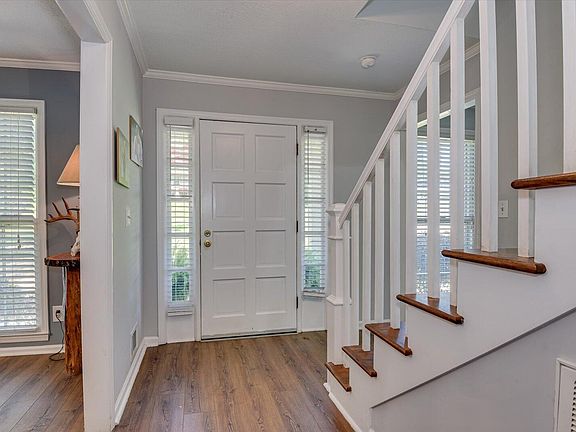 Additional features include a versatile flex room off the foyer, ideal for a home office, playroom, or guest bedroom; a powder room with tile flooring and a pretty vanity with a solid surface sink; LVP flooring throughout the main level; crown molding; gorgeous lighting; floor-length windows; custom blinds; a walk-in laundry room with a sliding barn-style door, shelving, and overhead storage cabinet; a walk-out crawlspace foundation; covered stoop; landscaped yard; landscape lighting; and a fenced backyard.