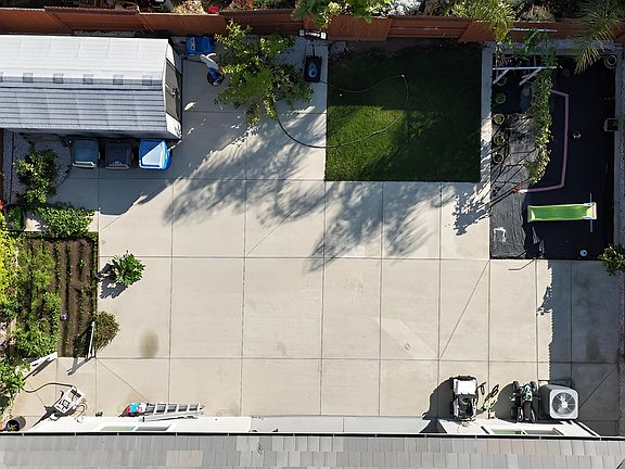 A huge cemented backyard provides an enormous, low-maintenance area for gatherings, sports, or play.