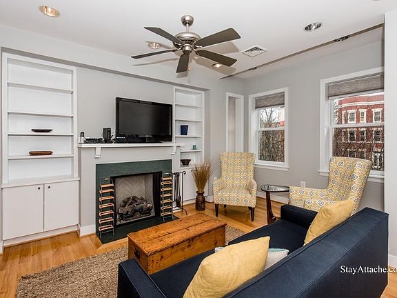 Fully furnished 2 bedroom, 2 bathroom condo on the second floor of an Adams Morgan brownstone. This stylish property includes hardwood floors, a gas fireplace, high ceilings with recessed lights, jetted tub, private rear balcony, in-unit washer and dryer, and central air, an open kitchen with granite countertops, gas stove, and stainless steel appliances. The Master bedroom has a queen bed, the second bedroom has a double bed. Also features a parking spot located behind the property.