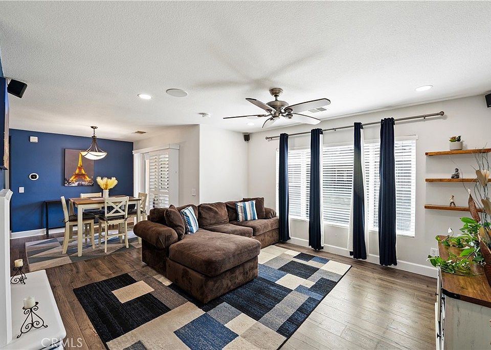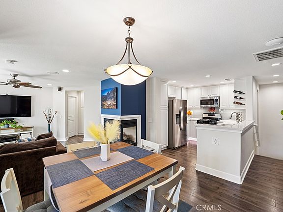 Absolutely fabulous 1404 sq ft townhome located in the highly desirable Mariposa community of Plum Canyon. This gorgeous unit is perfect for entertaining with an open floor plan that flows seamlessly from the kitchen through the dining area and into the living room. The kitchen features quartz counters, custom backsplash, beautiful white cabinets and stainless steel appliances. The spacious living room and dining area include a cozy fireplace and access to the balcony, which is a perfect place to enjoy your morning coffee or sip on your favorite cocktail as you enjoy our wonderful Southern California nights. The primary bedroom is large and has a big walk-in closet and en-suite bathroom with dual sinks. The secondary bedroom is also an ample size and is adjacent to the second bathroom, which also includes dual sinks. The townhome also has direct access to the private garage, additional carport space, separate laundry room, upgraded flooring and recessed lighting. A huge plus is the low HOA and no Mello Roos! The Mariposa complex has a community pool with cabanas, spa, clubhouse, BBQ area and playgrounds. Located near top rated schools and the Skyline Ranch Plaza.