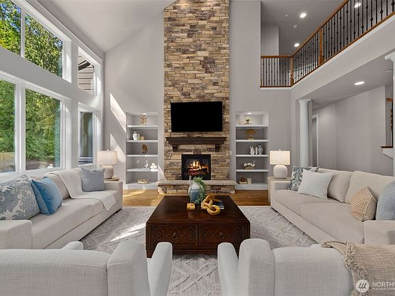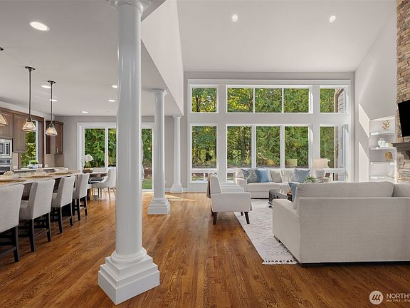 Amid the gated estate neighborhood of Aldarra Ridge, this 2014 Murray Franklyn home rests on nearly 3 acres, embraced by 200+ acres of protected woodlands. Sun-dappled lawns stretch wide, a sanctuary of calm, graced by visiting deer moving gently through the stillness. The enduring Northwest craftsman design offers honey-hued hardwoods, lofty ceilings and crisp millwork. Two-story windows flood the great room with light, where wood and stone radiate warmth. The main-floor primary suite is a serene retreat with garden patio, dual closets, and spa bath. A spacious bonus room, office and oversized 4-car garage provide space for work and play. A life of quiet beauty and rare serenity, just moments from Aldarra Golf Club, Redmond, and Sammamish.