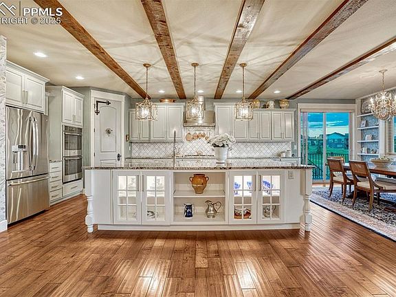 Discover the rare blend of timeless elegance and Colorado beauty in this English Manor estate, tucked within the coveted Kings Deer Highlands on 2.5 acres of rolling hills and mountain views. Designed for those who appreciate refined living, the home is both a private retreat and a gathering place, where every space tells a story of grace and comfort. Step through the doors and into a grand living room where vaulted, beamed ceilings and a stately fireplace frame sweeping vistas of Pikes Peak. Light dances off custom chandeliers and designer finishes, creating a warm yet sophisticated atmosphere. The chef’s kitchen—anchored by a custom island and premium appliances from Dacor and Miele—is more than a workspace; it’s the heart of the home, inviting both quiet mornings over coffee and lively evenings with friends. The primary suite offers a sanctuary on the main level, with a spa-inspired bath and a dream-worthy closet that feels like a boutique. Multiple terraces, including a covered space for year-round enjoyment, extend the living outdoors—perfect for evenings spent under Colorado’s endless skies. Upstairs and down, versatile family rooms and private offices adapt easily to today’s lifestyle, whether for work, play, or quiet retreat. Recent updates elevate the home’s charm—Schonbek lighting, Farrow & Ball cabinetry hues, richly detailed fireplace surrounds, and luxurious wall treatments—all curated to enhance both beauty and function. Outdoors, new landscaping, irrigation, and fresh paint set a picturesque backdrop. Perfectly positioned between Denver and Colorado Springs, with access to top-rated D38 schools, this estate offers not just a residence, but a lifestyle.