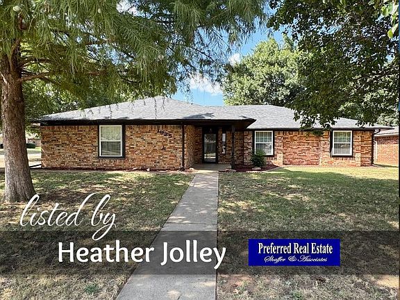 Listed by Heather Jolley 580-467-4569, Preferred Real Estate. Welcome to this beautifully updated brick home offering comfort, style, and plenty of space. This 3-bedroom, 2-bathroom residence sits on a spacious corner lot with mature trees. Step inside to an inviting living room with vaulted ceilings, wood-look tile floors, and a cozy brick fireplace perfect for relaxing or entertaining. The large kitchen is a showstopper, featuring bold green cabinetry, stainless steel appliances (including double ovens), modern lighting, ample cabinet and counter space, and a breakfast bar with seating. The primary bathroom offers a split vanity with separate closets and a newly remodeled shower. The secondary bedrooms are generously sized with abundant natural light, and the bathrooms are tastefully updated. A fenced backyard provides room for outdoor enjoyment, storage shed, storm cellar and kids play set. Located in a well-established neighborhood, this home is close to schools, shopping, and parks. Move-in ready and full of character, it’s the perfect blend of classic charm and modern upgrades. Updates over the past few years to present include: new garage door, garage opener, hot water heater, primary shower, ac condenser and fan motor, tv mounts, carpet in the sunroom, interior paint, cabinetry paint and more! All kitchen appliances are newer. The refrigerator, washer and dryer convey with the property. Call for a showing before this little gem is gone.