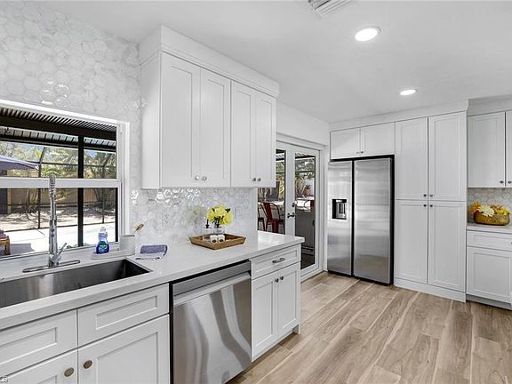 Welcome to your beautifully remodeled island oasis on Marco Island! This stunning 3-bedroom, 2-bathroom home has been thoughtfully upgraded from top to bottom and is move-in ready—perfect for those seeking the ultimate island lifestyle. Step inside to an open, airy layout featuring brand new quartz countertops, stylish backsplash, and stainless steel appliances, all highlighted by soft-close cabinetry. Additional counter space perfect for a dedicated coffee station complete with a beverage refrigerator make this kitchen ideal for both everyday comfort and entertaining. The spacious primary suite offers a peaceful retreat with a luxurious ensuite bathroom featuring a soaking tub, walk-in shower, and dual sinks. Throughout the home, you'll find new LVP and tile flooring, fresh interior and exterior paint and upgraded lighting and fixtures for a modern, cohesive look. Enjoy peace of mind with a brand new water heater and all-impact windows and doors throughout the home. Outside, relax or entertain in style on the expansive lanai featuring a recoated fiberglass saltwater pool, brand new outdoor summer kitchen with BBQ, and lush landscaping supported by a new automatic sprinkler system. This home comes beautifully decorated, with furnishings negotiable, offering a seamless move-in experience. Located just a short ride to the beach, this home makes a perfect personal retreat or nicely-performing investment. Don’t miss this completely updated gem—island living starts here!